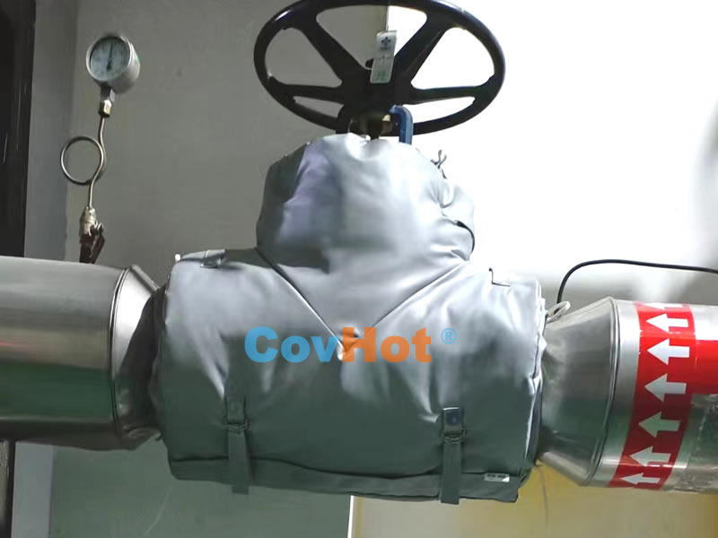 收到保溫套后每包貨物都會有產品清單對應產品,以DN100截止閥為例,找到對應型號的保溫套,打開魔術貼,對閥門進行包裹,閥門上有些執行器管線,儀表開孔都已經提前設計,按照位置安裝即可,包裹完成后將魔術貼粘緊,同時收緊法蘭處裙邊拉帶,緊固繩帶系蝴蝶結,拉帶進行緊固,一個閥門的軟外衣就穿戴完畢了。